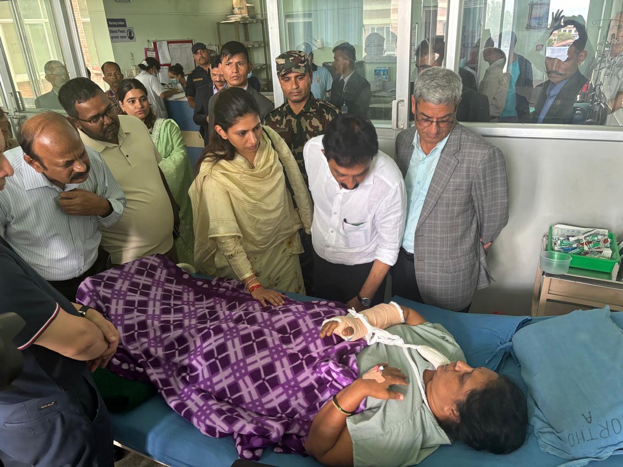 घाइतेहरुको अवस्थाबारे जानकारी लिएसँगै त्रिवि शिक्षण अस्पताल परिसरमा सञ्चारकर्मीहरुसँग कुराकानी गर्दै गृहमन्त्री लेखकले घाइतेहरुको उचार राम्रोसँग भइरहेको बताए । ‘नेपाली सेना, सशस्त्र प्रहरी र नेपाल प्रहरीले अत्यन्त मेहनतका साथ धेरै चाँडो काम गरेर केही मानिसहरुलाई बचाउन सकियो । केही मानिसहरुको मृत्यु पनि भएको छ, दुःखद् घटना भएको छ । घाइतेहरुको यहाँ उपचार भइरहेको छ । अहिले राम्रोसँग उपचार भइराखेको छ । भारतबाट पनि एकजना राज्यमन्त्रीजी आउनु भएको छ । उहाँकै निर्वाचन क्षेत्रका मानिसहरु हुनुहुँदोरहेछ, महाराष्ट्रको । उहाँ पनि भेटघाट गरिहनु भएको छ,’– मन्त्री लेखकले भने ।
