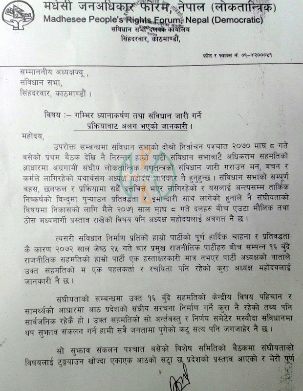काठमाडौं । मधेशी जनअधिकार फोरम लोकतान्त्रिकले संविधानसभाका अध्यक्ष सुवास नेम्वाङलाई संविधानसभा छोडेको आधिकारिक पत्र लेखी मंगलबार बुझाएको छ । सिमाकंनमा थारु र मधेसीले अधिकार नपाएको भन्दै असन्तुष्ट फोरम दलहरुले गरेको १६ बुँदे सहमतिका हस्ताक्षर कर्ता हुन् । १६ सहमतिमा मधेसीका तर्फबाट आलोचना खेपेका फोरम नेता गच्छेदारले आफुले देश जोगाउन हदैसम्मको लचकता अपानाएको बताएका थिए । १६ बुँदे सहमतिपश्चात पश्चिम नेपालको सुर्खेत र कणार्लीका जनताले आन्दोलन गरेका थिए । सोही आन्दोलनलाई आधार बनाइ सिमाकंन हेरफेर गरेका मुख्य तीन ठुला दलले मधेश र थारुहरुलाई वेवास्ता गरेका भन्दै फोरम नेता गच्छदार असन्तुष्ट छन् । फोरमका तर्फबाट लिखित रुपमा संविधानसभाबाट बाहिरिएका पत्र बुझाउँदै गच्छदा तथा अर्का नेता जितेन्द्र देवले आफुहरुलाई जर्वजस्ती संविधानसभाबाट बाहिरिन बाध्य पारिएको बताएका थिए । सभाध्यक्ष नेम्वाङसामु पत्र पढेर सुनाउँदै गरेका जितेन्द्र देव निकै भावुक भएका थिए । याँहा प्रस्तुत छ फोरम लोकतान्त्रिकको पत्र जस्ताको तस्तै    \"gachhadar_-patra-1\"                                         \"gachhadar_patra-2\" \"gachhadar_-patra-1\"