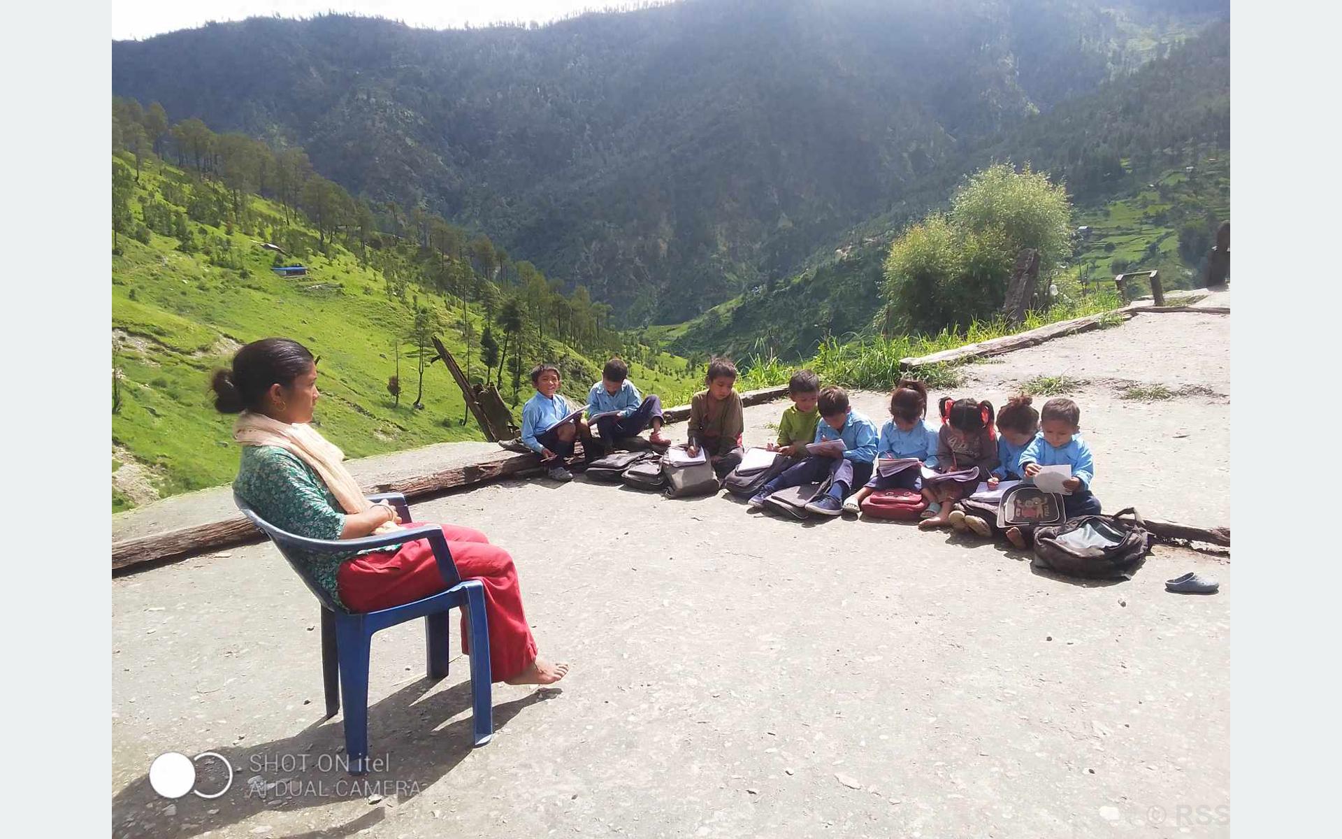 मुगु । गत ४ गते विद्यालय भवनमाथिबाट पहिरो आई विद्यालय भवनमा क्षति पुर्याएपछि पढाउने, बस्ने भवन नहुँदा छायानाथ रारा नगरपालिका– ७ माथि घुइर गाउँमा रहेको भुवानी आधारभूत विद्यालयका शिक्षक गाउँलेका घरका छतमा बालबालिका राखी अध्यापन गराइँदै।
