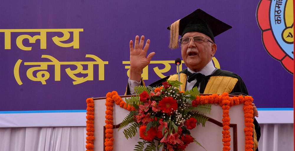आफूले झापाबाट गत वर्ष अनलाइन कक्षा दिएका कारण विद्यार्थीको नतिजामा सुधार आएको उल्लेख गर्दै यस अभ्यासलाई देशभर विस्तार गर्ने बताए । प्रधानमन्त्री ओलीले विश्वविद्यालयमा विभिन्न सङ्कायमा दीक्षित विद्यार्थीलाई आफूले प्राप्त गरेको ज्ञान–सीपलाई सही सदुपयोग गर्न तथा समाजका लागि सुयोग्य नागरिक बन्न आग्रह गरे ।