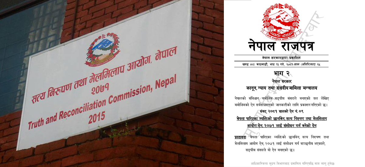 काठमाडौं । बेपत्ता पारिएका व्यक्तिको छानबिन आयोग र सत्य निरुपण तथा मेलमिलाप आयोग ऐन २०७१ लाई संशोधन गर्न बनेको ऐन राजपत्रमा प्रकाशित भएको छ ।
