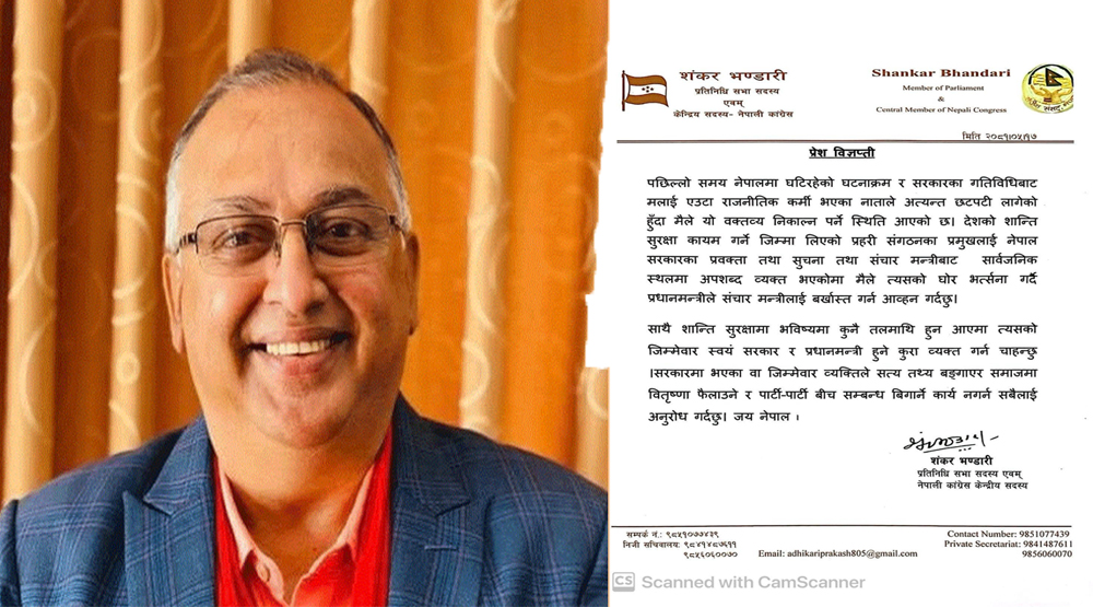 काठमाडौं । नेपाली कांग्रेसका केन्द्रीय सदस्य तथा प्रतिनिधि सभा सांसद शंकर भण्डारीले सरकार प्रवक्तासमेत रहेका सञ्चार तथा सूचना प्रविधि मन्त्री पृथ्वीसुब्बा गुरूङलाई बर्खास्त गर्न माग गरेका छन्।