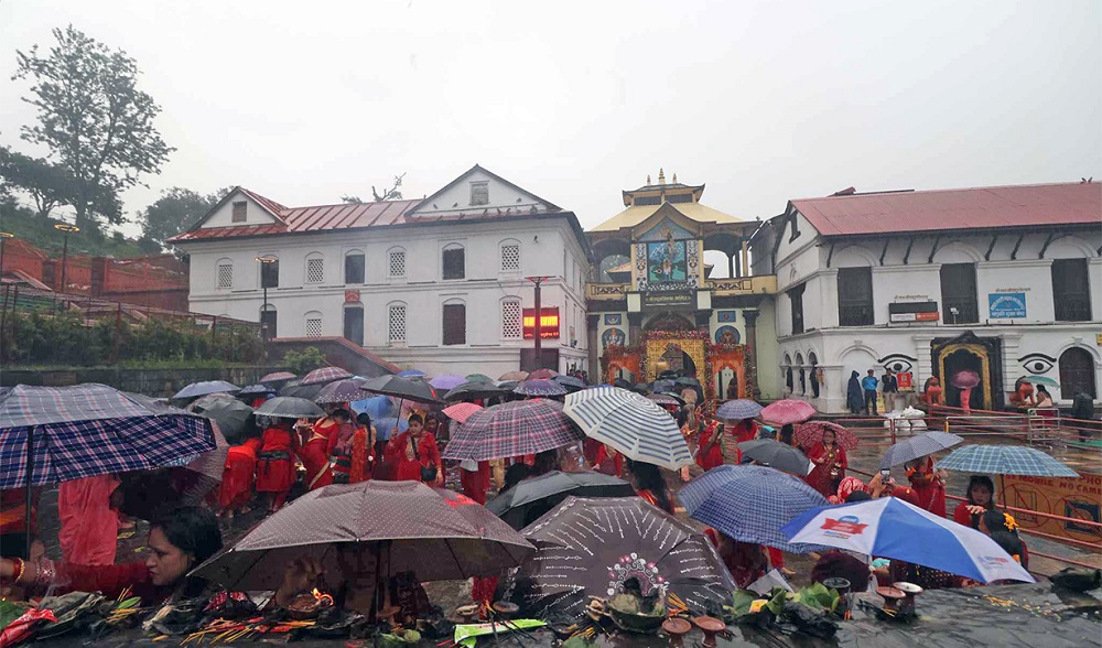 रातो, हरियो र पहेँलो पहिरनमा सजिएका महिला भक्तजनको पशुपति क्षेत्रमा भीड देखिन्छ। बिहान केही समय वर्षाले दर्शनार्थी प्रभावित भए पनि अहिले सहज रूपमा दर्शन एवं पूजा आराधना गरिरहेको उनले बताए । पानी रोकिएसँगै पशुपति क्षेत्रमा हजारौँ भक्तजनको घुइँचो लागेको छ।