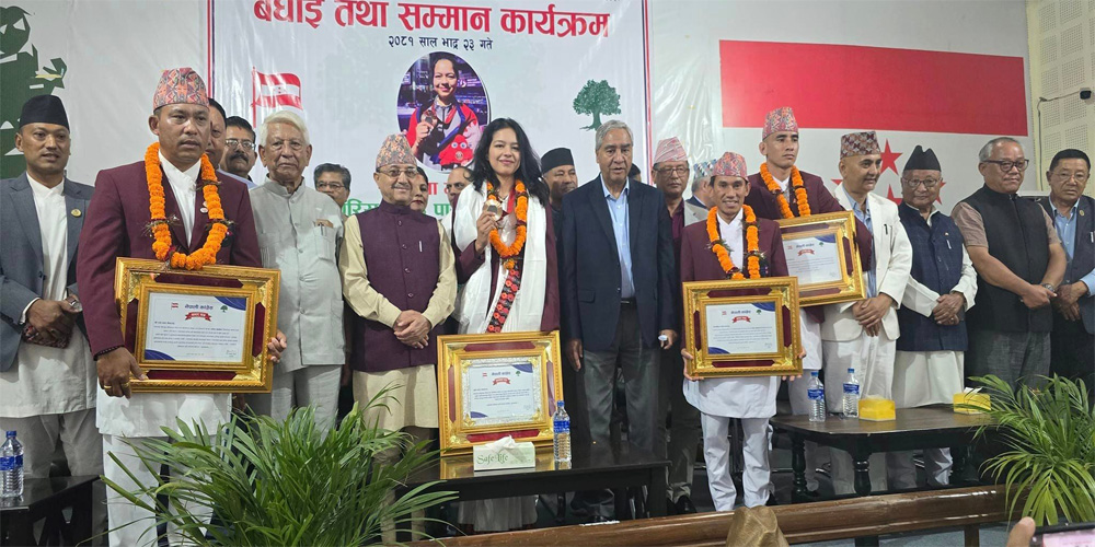 काठमाडौं । पेरिस पारा ओलम्पिकका नेपाललाई ऐतिहासिक कांस्य पदक दिलाउन सफल पलेशा गोवर्धनलाई नेपाली कांग्रेस पार्टीले पाँच लाख रुपियाँ पुरस्कारसहित सम्मान गरेको छ ।