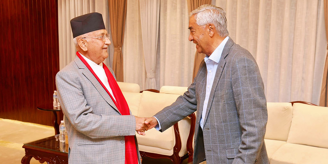 काठमाडौं । सत्तारुढ दलका दुई शीर्ष नेताबिच भेटवार्ता भएको छ । केही मन्त्रीसहित प्रधानमन्त्री तथा एमाले अध्यक्ष केपी शर्मा ओली र नेपाली कांग्रेसका सभापति शेरबहादुर देउवाबिच भेटवार्ता भएको हो । भेटवार्तामा सरकारका कामकारबाहीबारे छलफल भएको बताइएको छ ।