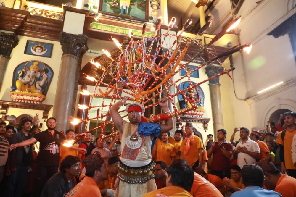 गएराति ८ बजे मध्यपुरथिमि –५ का वीरेन्द्रभक्त श्रेष्ठले मध्यपुरथिमि दिगुटोलस्थित दिगु भैरव अगाडिको डबलीमा करिब १० इन्च लामो सियोबाट जिब्रो छेडाएर कमिनायबाट ४० किलोको भ्वयः अर्थात महादीप बोकेर खाली खुट्टाले पशुपति नाथ मन्दिर यात्रा गरेका थिए ।