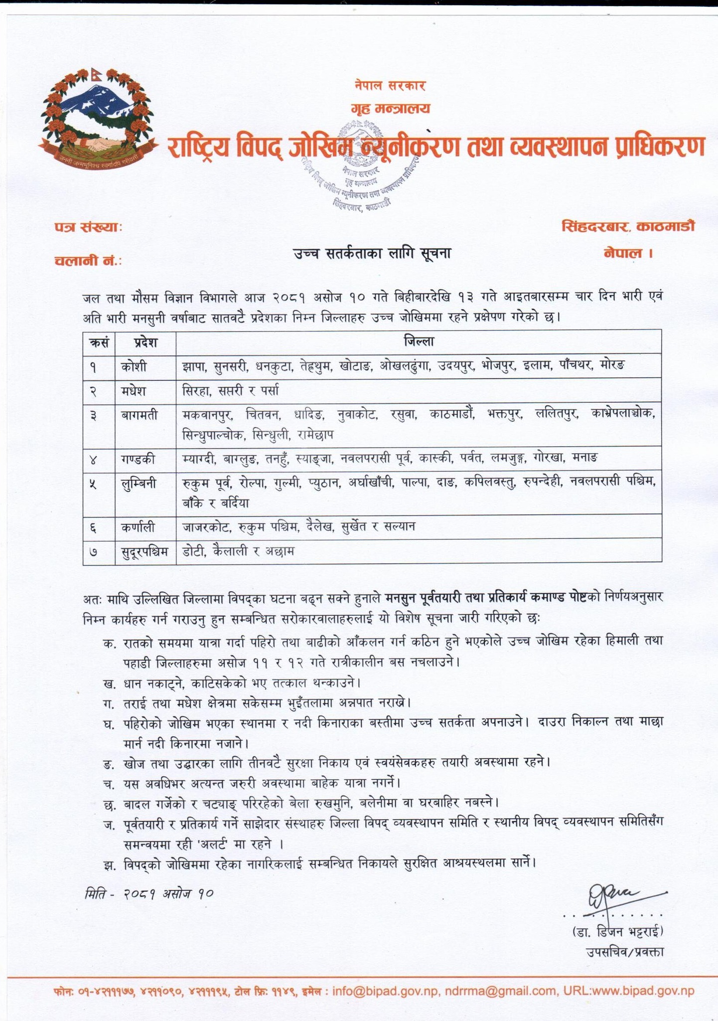 प्राधिकरणले धान नकाट्ने, काटिसकेको भए तत्काल थन्काउने, तराई तथा मधेस क्षेत्रमा भुइँतालमा अन्नपात नराख्ने, पहिरो जोखिम भएका स्थानमा र नदी किनारा बस्तीमा उच्च सतर्कता अपनाउन र दाउरा निकाल्न तथा माछा मार्न नदी किनारामा नजाने सूचना जारी गरेको छ ।
