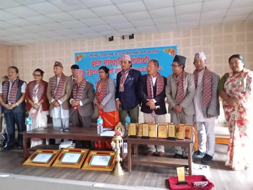 बिहिबारदेखि सुरु सुरु भएको ‘मौलिक रैथाने लोकनृत्य कार्यशाला एवं बृहत सांस्कृतिक संगोष्ठी २०८१’ शनिबार बेलुका सम्पन्न भएको छ । यो प्रशिक्षणमा देशभरका ६ दर्जन भन्दा बढी कलाकारहरुले नृत्य प्रशिक्षण लिए । उनीहरुलाई नृत्य निर्देशक भैरवबहादुर थापाले प्रमाणपत्र प्रदान गरे ।