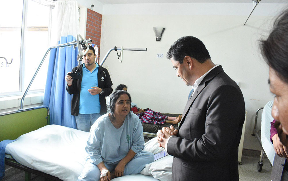 मन्त्री पौडेलले उपचाररत बिरामीहरुसँग सेवाबारे जानकारी लिंदै निःशुल्क उपचार पाए नपाएको तथा गुणस्तर कस्तो रह्यो भन्दै बिरामीसँग प्रश्न गरे । परिवारका सात जना गुमाएका माइला तामाङसँग परिवारको दुःखप्रति सहानुभूति प्रकट गर्दै उनले उपचार सेवामा कुनै कमी भए भन्न आग्रह गरे । जवाफमा तामाङले भने, उपचार त राम्रो पाइरहेको छु । पैसा तिर्नु पनि परे । तर परिवारका कोही बचेनन् बस्ने घर पनि छैन । सरकारले उपचारपछि जाने ठाउँ पनि खोजिदिए हुन्थ्यो, जवाफमा मन्त्री पौडेलले उपचारको सबै जिम्मा सरकारले लिने भन्दै बाँकी सहयोगका लागि पनि सकेको पहल हुने बताए ।