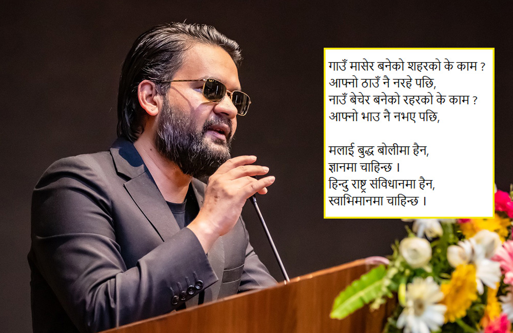 काठमाडौं । काठमाडौं महानगरका मेयर बालेन शाहले सामाजिक सञ्जालमा एक कविता पोष्ट गर्दै हिन्दु राष्ट्र संविधानमा हैन, स्वाभिमानमा चाहिने बताएका छन् ।