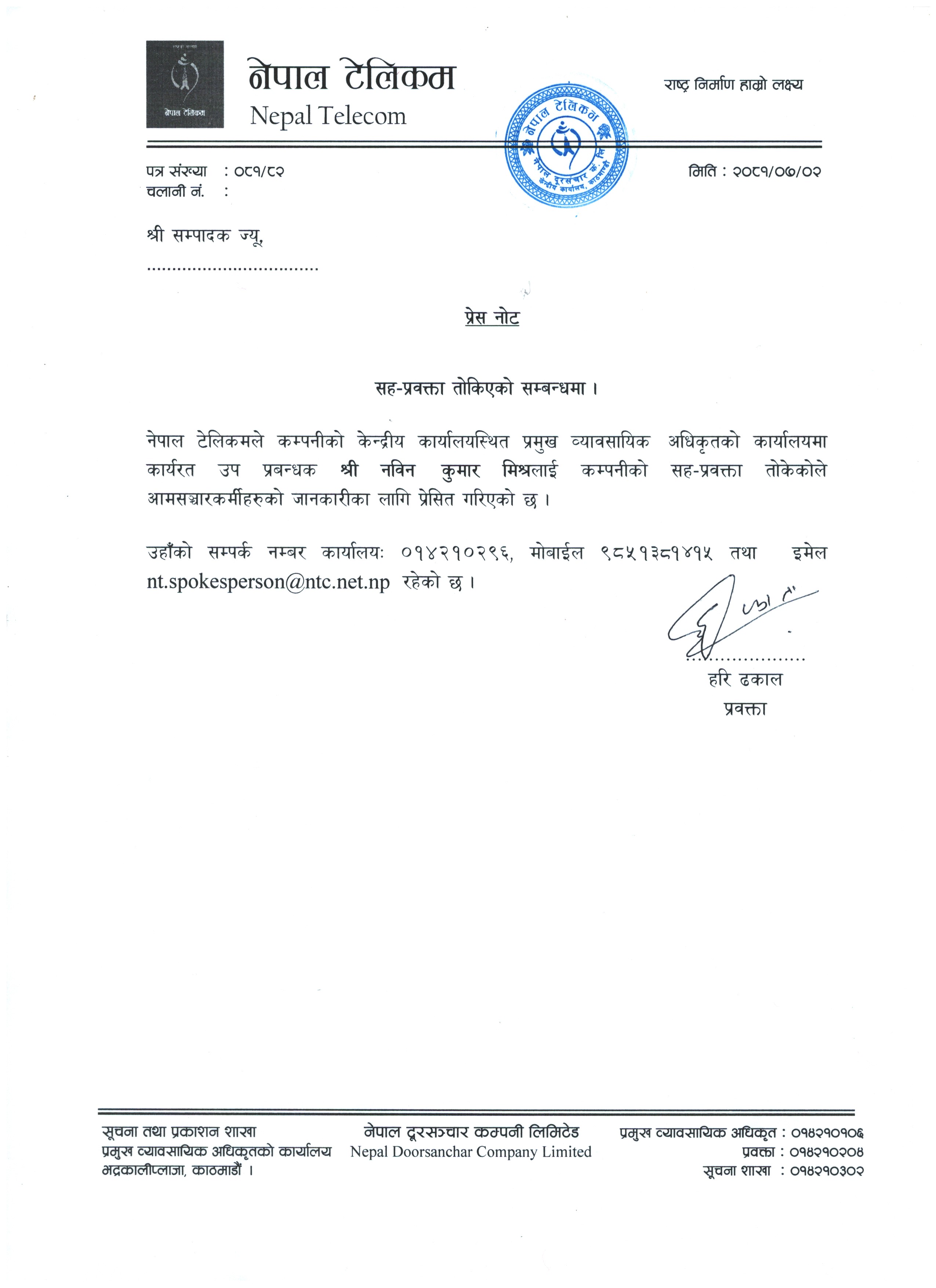काठमाडौं । नेपाल टेलिकमले कम्पनीको सह–प्रवक्ता नियुक्त गरेको छ । कम्पनीले केन्द्रीय कार्यालयस्थित प्रमुख व्यावसायिक अधिकृतको कार्यालयमा कार्यरत उप प्रबन्धक नविन कुमार मिश्रलाई कम्पनीको सह–प्रवक्ता तोकेको हो ।