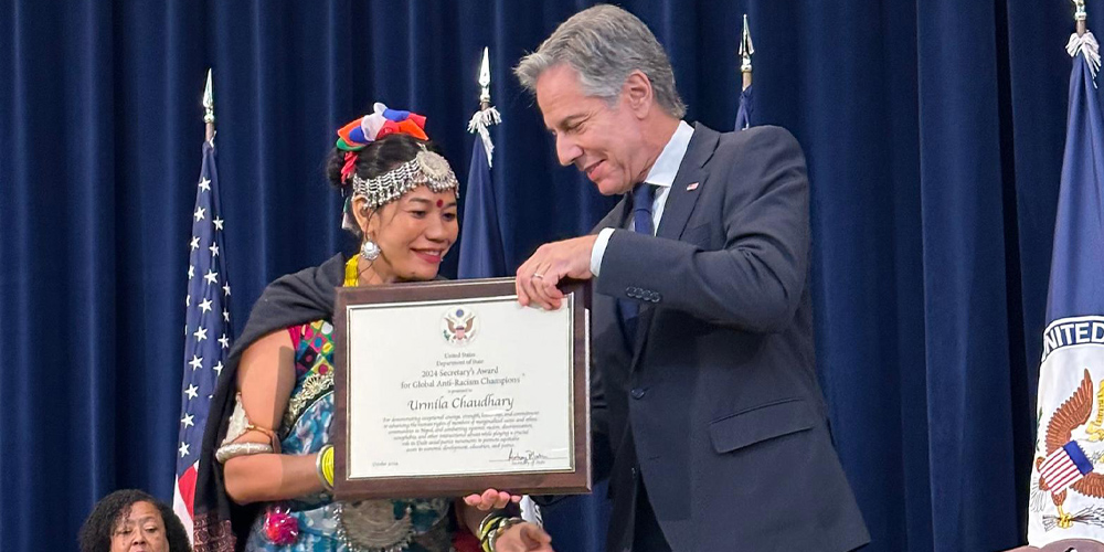 वाशिङ्गटन डिसी । नेपालकी सामाजिक अभियन्ता उर्मिला चौधरीे ग्लोबल एन्टी रेसिजम च्याम्पेनसिप अवार्डद्वारा सम्मानित भएको छिन् । अमेरिकी विदेशमन्त्री एन्टोनी व्लिङ्केनले चौधरीसहित छ देशका सामाजिक अभियन्तालाई सोमबार यहाँ आयोजित कार्यक्रममा उक्त अवार्ड प्रदान गरेको थिए ।