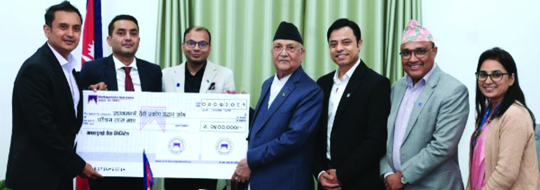 बैंकका अध्यक्ष रोशन केसीले प्रधानमन्त्री केपी शर्मा ओलीलाई आइतबार २५ लाख रुपैयाँको चेक हस्तान्तरण गरेको बैंकले जनाएको छ। उक्त सहयोग रकम हस्तान्तरण कार्यक्रममा बैंकका प्रमुख कार्यकारी अधिकृत, सञ्चालक समितिका सदस्यहरू तथा बैंक व्यवस्थापनका उच्च पदस्थ पदाधिकारीहरूको उपस्थिति रहेको थियो।