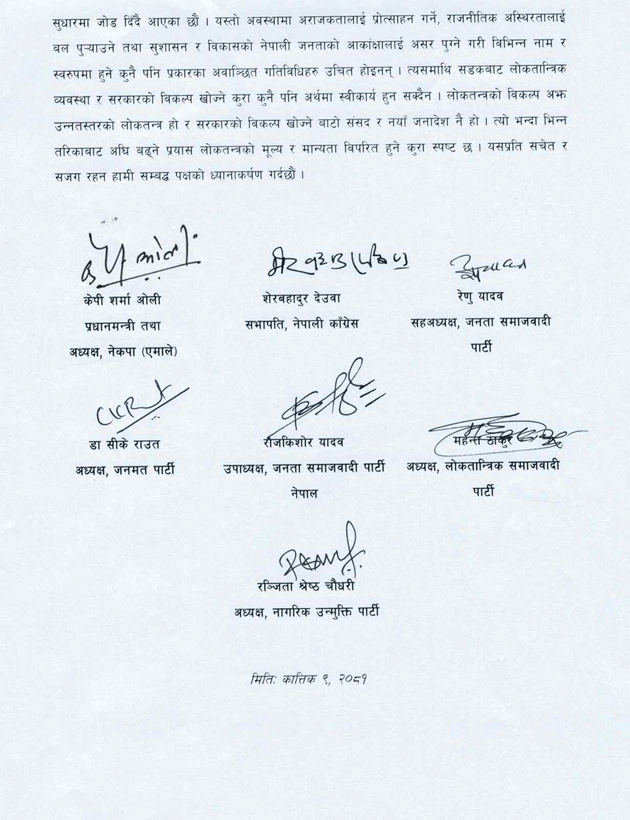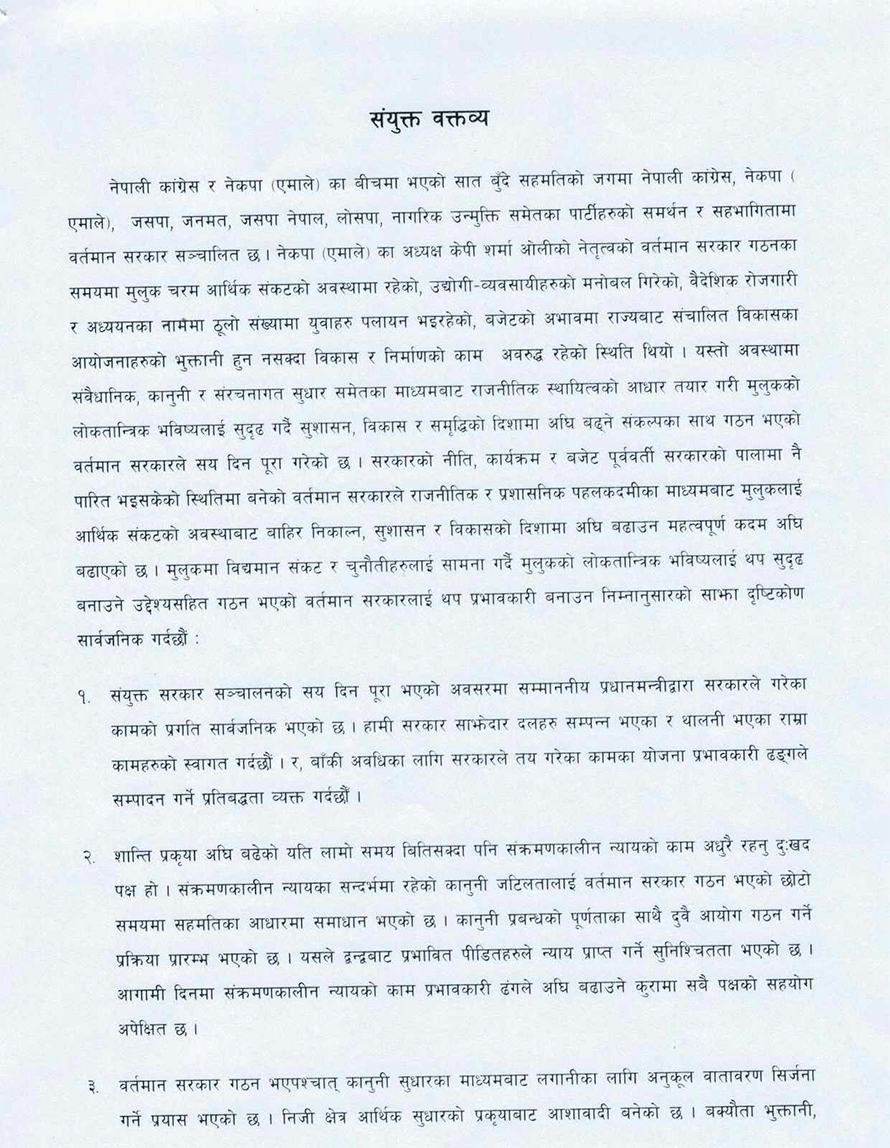 बालुवाटारमा भएको छलफलपछि नेपाली कांग्रेस, नेकपा एमाले, जसपा, जसपा नेपाल, जनमत पार्टी, लोसपा र नागरिक उन्मुक्ति पार्टीले संयुक्त वक्तव्य जारी गरेका हुन् । बैठकले सरकारको सय दिन, समसामयिक मुद्दा र आगामी योजनाबारे संयुक्त वक्तव्य जारी गर्दै अवाञ्छित गतिविधिहरुप्रति सचेत र सजग रहन सम्बद्ध पक्षको ध्यानाकर्षण गराएको छ ।