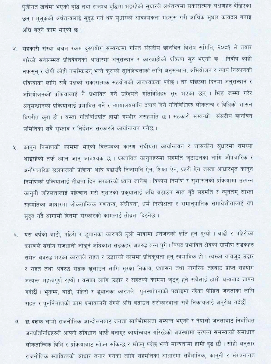 वक्तव्यमा सहकारी संस्था बचत रकम दुरुपयोग सम्बन्धमा गठित संसदीय छानबिन विशेष समिति, २०८१ ले तयार पारेको सर्वसम्मत प्रतिवेदनका आधारमा अनुसन्धान र कारबाहीको प्रक्रिया सुरु भएको जनाइएको छ । त्यस्तै भिड जम्मा गरेर अनुसन्धानको प्रक्रियालाई प्रभावित गर्ने र न्यायालयमाथि दबाब दिने गतिविधि लोकतन्त्र र विधिको शासन विपरीत कुरा भएको पनि सत्तारुढ दलको ठहर छ । ‘यस्ता गतिविधिप्रति हाम्रो गम्भीर असहमति छ । सहकारीसम्बन्धी संसदीय छानबिन समितिका सबै सुझाव र निर्देशन सरकारले कार्यान्वयन गर्नेछ,’ वक्तव्यमा लेखिएको छ ।