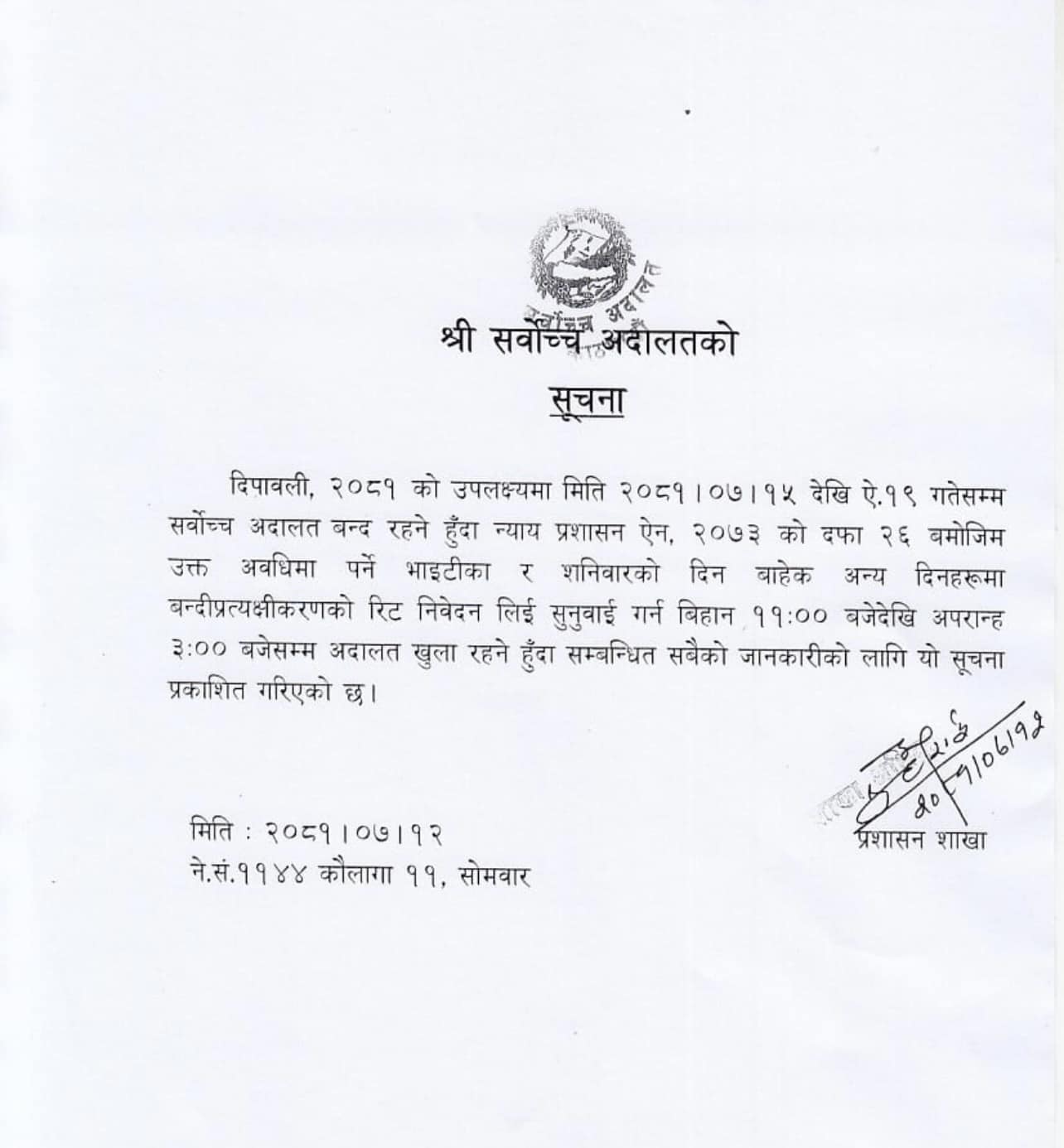 अदालत बन्द भएपनि न्याय प्रशासन ऐन, २०७३ को दफा २६ बमोजिम उक्त अवधिमा पर्ने भाइटीका र शनिबारको दिनबाहेकका दिनहरूमा बन्दी प्रत्यक्षीकरण रिटको सुनुवाइ हुने सुचामा उल्लेख छ ।
