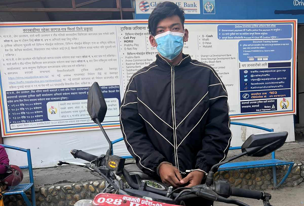 नियन्त्रणमा आउनेमा काठमाडौंकै बाइसधारा बस्ने धादिङको बैरेनीका २४ वर्षीय आकाश तामाङ रहेका छन् । काठमाडौंको काठमाडौं महानगरपालिका १५ बस्ने सुसान बुद्दचार्यले बागमती प्रदेश-०२-०२४ प ६६६८ नम्बरको मोटरसाइकल डल्लु आवासबाट हराएको भनि खोजतलासका लागि काठमाडौं उपत्यका ट्राफिक प्रहरी कार्यालय रामशाहपथमा निवेदन दिएका थिए ।