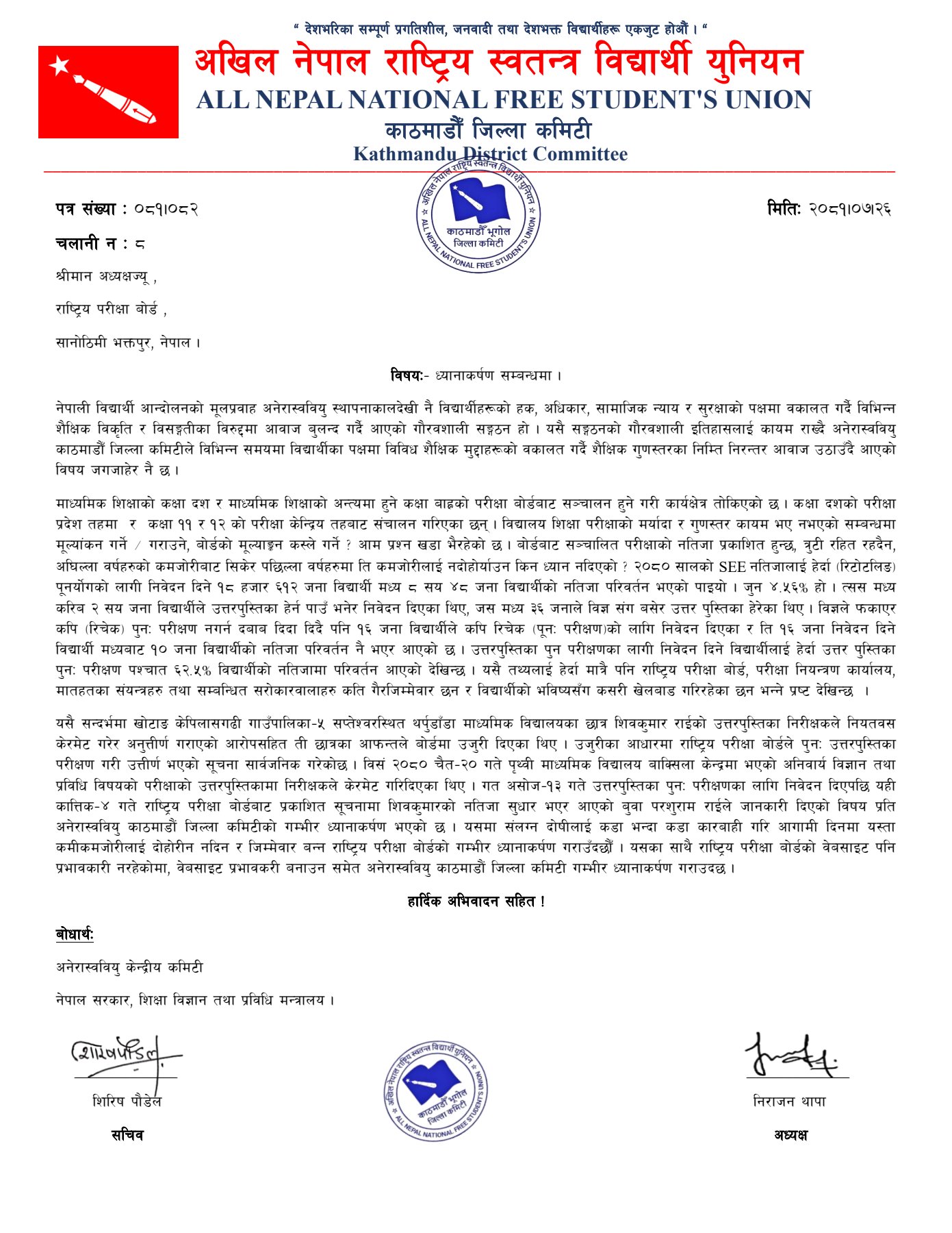 अनेरास्ववियु केन्द्रीय कमिटी सदस्य तथा काठमाडौँ जिल्ला इन्चार्ज धर्मराज तिमिल्सीनाको नेतृत्वको टोलीले परीक्षा नियन्त्रक नन्दलाल पौडेलसंग यस विषयमा छलफल गरेको थियो र परीक्षा नियन्त्रकका अनुसार २०८० को SEE नतिजालाई हेर्दा (रिटोटलिङ) पूनर्योगको लागी निवेदन दिने १८ हजार ६१२ जना विद्यार्थी मध्य ८ सय ४८ जना विद्यार्थीको नतिजा परिवर्तन भएको पाइयो ।