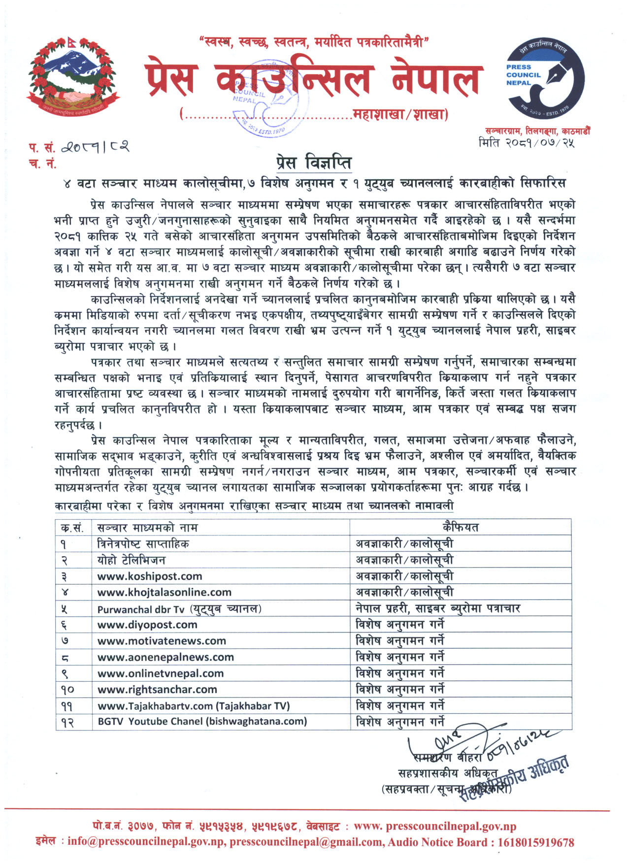 काउन्सिलको निर्देशन अटेर गर्ने, एकपक्षीय र तथ्यगत पुष्ट्याइँबेगर सूचना सामग्री सम्प्रेषण गर्ने ती सञ्चारमाध्यमलाई कारवाही गरिएको प्रेस विज्ञप्ति मार्फत जानकारी दिइएको हो । दशैं अघि काउन्सिलले ३ वटा सञ्चारमाध्यमलाई कालोसूचीमा राखेको थियो ।