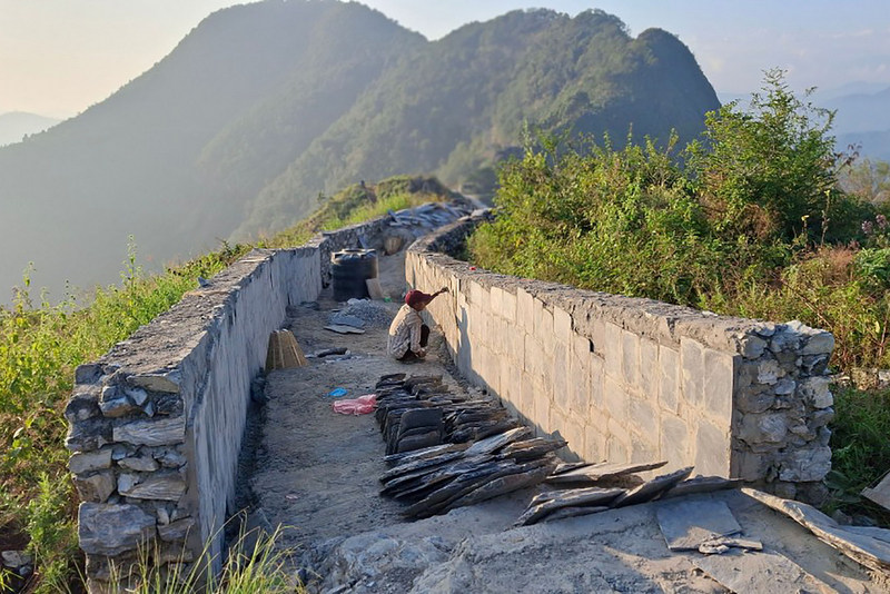 थापाका अनुसार अहिले दुवैतर्फ पर्खाल लगाउने, सिँढी बनाउने, पर्खालको दायाँबायाँ भित्तामा स्लेट ढुङ्गा छाप्नेलगायत काम भइरहेको छ। उनले भने, ‘केही समय यसको काममा ढिलाइ भएको थियो, गाउँपालिकाले ताकेता गरेसँगै अहिले कामको गति बढेको छ।’