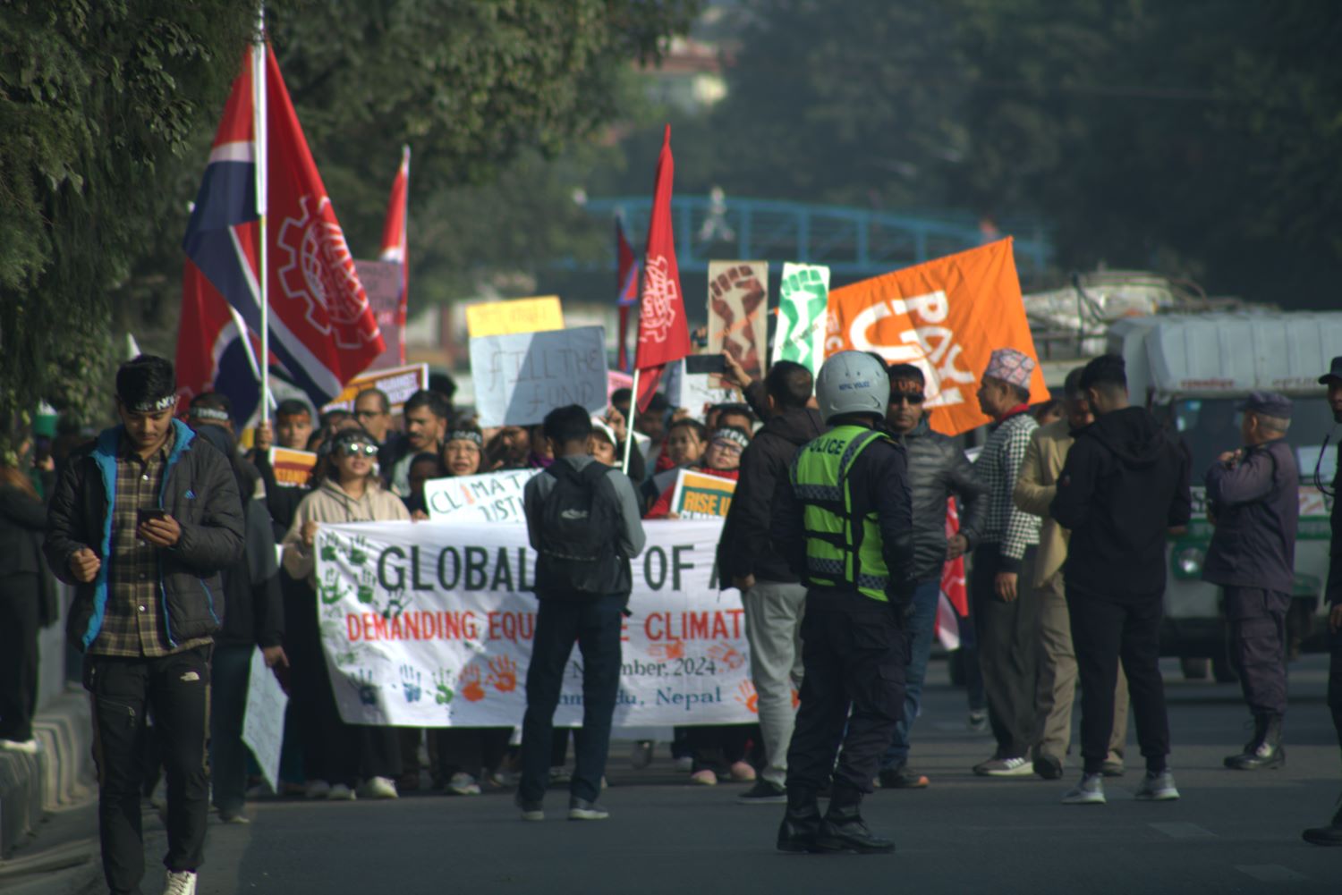 काठमाडौं- नेपालमा सक्रिय जलवायु अभियन्ताहरू सडकमा उत्रिएका छन्। नागरिक समाज,पिछडिएको वर्ग,अपांगता भएका व्यक्ति, साना किसान, आदिवासी समूह र स्थानीय समुदायहरूको ठूलो संख्याले शनिबार सडकमा प्रदर्शन गरेको हो।