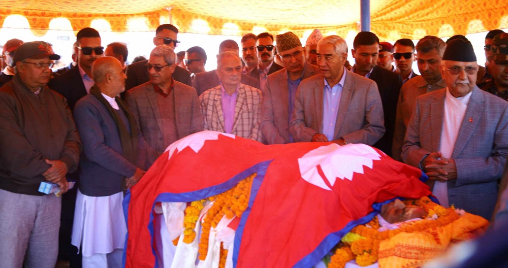 काठमाडौँ। प्रधानमन्त्री केपी शर्मा ओलीले पूर्वसभामुख दमननाथ ढुङ्गानाको पार्थिव शरीरमा राष्ट्रिय झण्डा ओढाएर सम्मान प्रकट गरेको छन । सोमबार ज्ञानेश्वरस्थित सानो गौचरन पुगेर उनले ढुङ्गानाप्रति श्रद्धाञ्जली व्यक्त गरेको हो ।