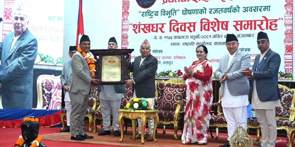 मङ्गलबार राष्ट्रपति भवन शीतल निवासमा शंखधर साख्वा: लाई राष्ट्रिय विभूति घोषणा गरिएको रजत वर्षको अवसरमा आयोजित कार्यक्रममा उनले आफ्नै देशको नामबाट स्थापित विश्वको एउटै मात्र संवत् भएकाले नेपाल संवत् सम्पूर्ण नेपाली जनताको गौरवमय राष्ट्रिय सम्पदा पनि भएको बताए।