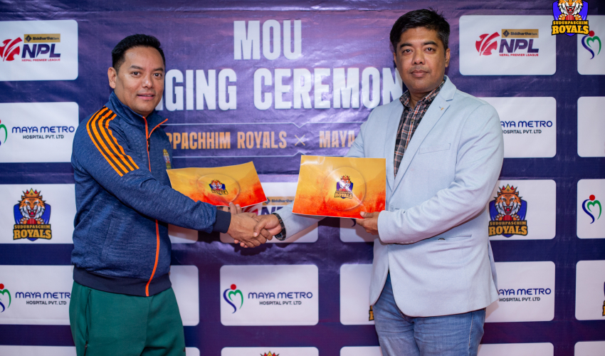 धनगढी । नेपाल प्रिमियर लिग (एनपिएल) को टोली सुदुरपश्चिम रोयल्स र माया मेट्रो अस्पतालबीच प्रायोजन सम्झौता भएको छ । माया मेट्रो र रोयल्सबीच मेडिकल पार्टनरका लागि एक कार्यक्रमका बिच सम्झौता भएको हो ।