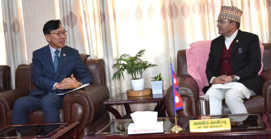 काठमाडौं। नेपाल सरकारका वन तथा वाताबरणमन्त्री ऐनबहादुर शाही ठकुरी र दक्षिण कोरियाका राजदूत पार्क टेइयंगबिच बिहीबार मन्त्रालयमा शिष्टाचार भेटवार्ता भएको छ ।