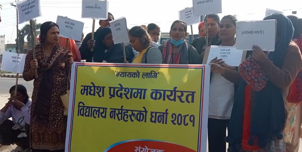 अहिले मधेश प्रदेशका विभिन्न जिल्लामा विद्यालय नर्सका रूपमा ४० जना कार्यरत छन् भने मौखिकको भरमा पाँच महिना काम गरेपछि पारिश्रमिक पनि पाएका छैनन् । यस अघि यही माग लिएर उनिहरूले प्रदेश सरकारसमक्ष ज्ञापनपत्र समेत बुझाउँदै मधेशका मुख्यमन्त्री सतीशकुमार सिंहको आवास अगाडि धर्नासमेत दिएका थिए । यता, शिक्षामन्त्री तिवारीसँग यही विषयमा जानकारी लिन खोज्दा उनको फोन सम्पर्क हुन सकेन ।