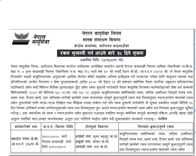 काठमाडौं । नेपाल वायुसेवा निगमले क्याप्टेन रोशन केसीको नाममा ३५ दिने सूचना जारी गरेको छ । रकम भुक्तानी गर्ने सम्बन्धमा निगमले बुधबार ३५ दिने सूचना जारी गरेको हो ।