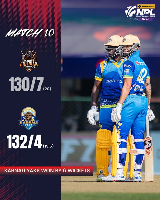 आजको पहिलो खेलमा चितवन राइनोजलाई ६ विकेट पराजित गर्दै उसले पहिलो जीत हासिल गरेको हो । त्रिभुवन विश्वबिधालय, किर्तिपुरस्थित क्रिकेट मैदानमा चितवनले दिएको १३१ रनको लक्ष्य कर्णालीले एक बल बाँकी छँदा ४ विकेट गुमाएर पूरा गर्न सफल भएको हो ।