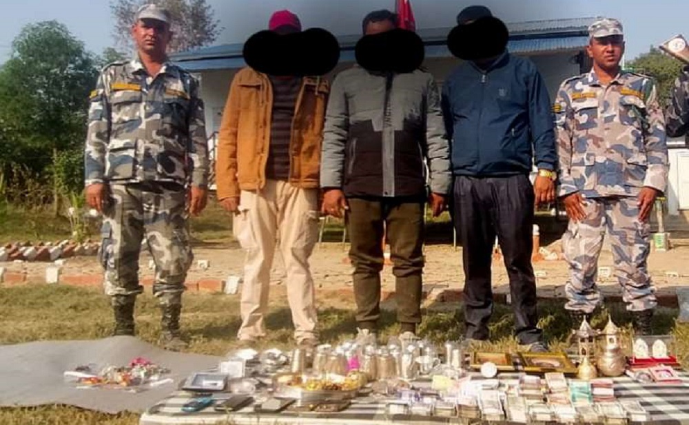 भारतबाट नेपालतर्फ आउँदै गरेका उनीहरूलाई शङ्का लागि जाँच गर्दा ८० लाख ७९ हजार ५ सय ६१ रुपैयाँ मूल्य पर्ने ६ सय २० ग्राम सुन, १५ लाख २८ हजार ४ सय ६० रुपैयाँ बराबरको ८ किलो ९ सय १४ ग्राम चाँदी, विभिन्न दरका ६ लाख ११ हजार ६ सय २५ भारतीय रुपैयाँ, साउदी रियाल, विभिन्न किसिमका चार थान मोबाइल सेट र चाँदीका लेप लगाएका भाडाकुडा फेला परेको हो।
