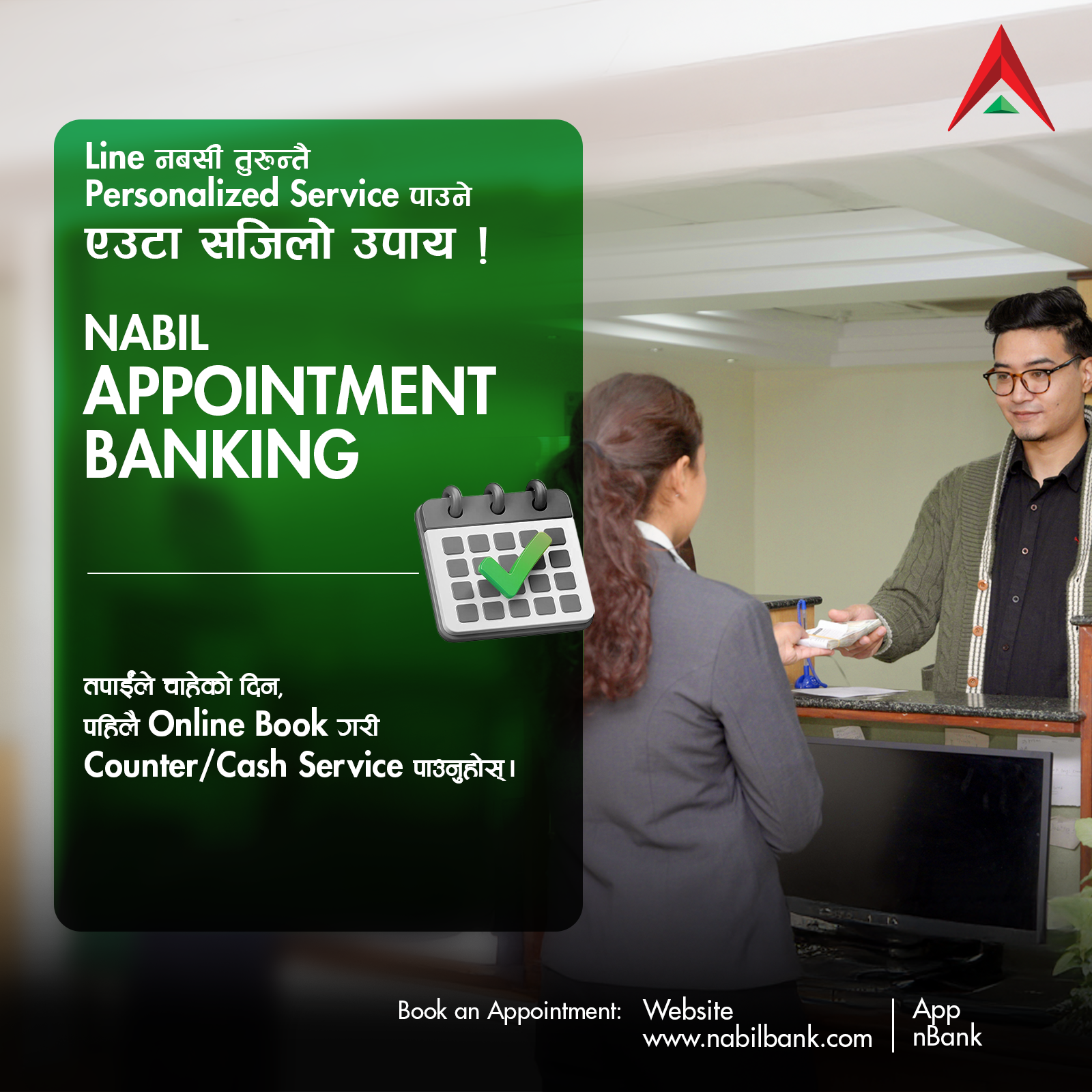 ग्राहकहरूले नबिल बैंकको वेबसाइट वा एनबैंक एप प्रयोग गरी सजिलै अपोइन्टमेन्ट बुक गर्न सक्छन्। ग्राहकले बैंकमा जानु अघि उल्लेखित प्लेटफममार्फत लिनुपर्ने सेवा र आफूलाई सहज हुने समय छनोट गर्ने सुविधा दिइएको छ। यसले समय व्यवस्थापनलाई ठुलो सहयोग पु¥याउने विश्वास गरिएको छ।