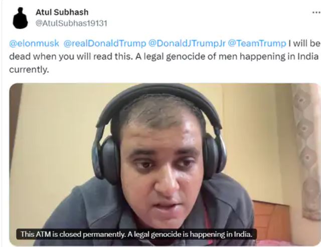 खासमा ३४ वर्षीय अतुल सुभाषले आफ्नी श्रीमती र सासुले पैसाको लागि दुव्र्यवहार गरेको आरोप लगाउँदै आत्महत्या गरेका हुन् ।