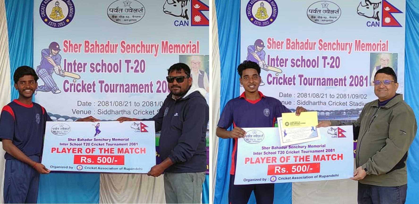 रुपन्देही क्रिकेट संघको आयोजना र पर्वत ज्वेलर्स, बैंकरोड, भैरहवाको मुख्य प्रायोजनामा जारी प्रतियोगिताको विजेता टिमले ५० हजार, उपविजेताले २५ हजारसहित ट्रफी, मेडल र प्रमाणपत्र प्राप्त गर्नेछन् । यस्तै, म्यान अफ द सिरिजले १० हजार, बेष्ट ब्याटर र बेष्ट बलरले जनही ५ हजार, प्रत्येक खेलको म्यान अफ द म्याचले ५ सय तथा बेष्ट अनुशासित टिमले ट्रफी र प्रमाणपत्र प्राप्त गर्ने खेल संयोजक भरत थापाले बताए । पुस २ गतेसम्म चल्ने प्रतियोगितामा जिल्लाका विभिन्न विद्यालयका २३ टिम सहभागी छन् ।