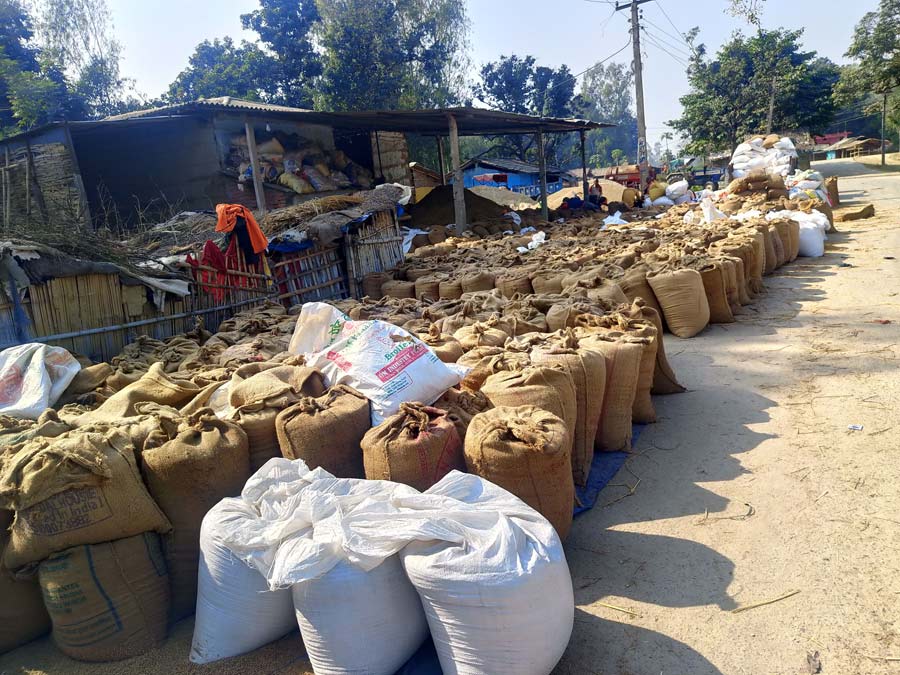 जलेश्वर । महोत्तरीको मनरा शिसवा नगरपालिका ६ मा चिसो मौसममा खुला आकाश मुनि बिक्री गर्न किसानले ल्याएको धान । रासस