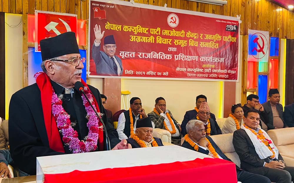 रुपन्देही । नेकपा (माओवादी केन्द्र)का अध्यक्ष तथा पूर्वप्रधानमन्त्री पुष्पकमल दाहाल प्रचण्डले जनता र परिवर्तनको पक्षमा लड्ने पार्टी माओवादी केन्द्र नै हो भनेर जनताले मनमनै फैसला गरिसकेको बताएका छन् । रुपन्देहीको तिलोत्तमामा आज (शनिवार) आयोजित नेकपा (माओवादी केन्द्र)सँग राष्ट्रिय जनमुक्ति पार्टी समाहित तथा राजनीतिक प्रशिक्षण कार्यक्रमलाई सम्बोधन गर्दै अध्यक्ष प्रचण्डले सो कुरा बताएका हुन् ।