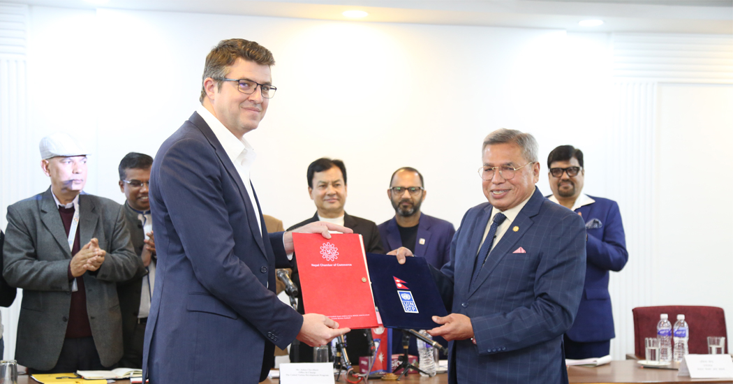 काठमाडौंको जमलस्थित चेम्बर भवनमा सोमबार आयोजित कार्यक्रममा चेम्बर अध्यक्ष कमलेश कुमार अग्रवाल र युएनडीपीका कार्यबहाक आवासीय प्रतिनिधी जुलिएन चेभिलार्डले हस्ताक्षर गरे । निजी क्षेत्रको क्षमता अभिवृद्धि, जलवायु परिवर्तन अनुकुलन, विपद् व्यवस्थापन एवम् युनडिपीले तय गरेका विकास लक्ष्यलाई पुरा गर्न सहकार्य गर्नेगरी हस्ताक्षर भएको नेपाल चेम्बर अफ कमर्सद्धारा जारी विज्ञप्तीमा उल्लेख छ ।