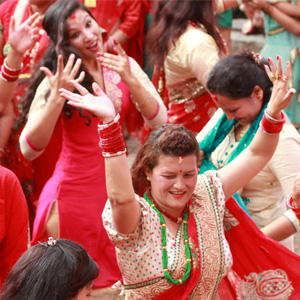 हरितालिका तीज पर्वको उपलक्ष्यमा पूजाआजा एवम् दर्शनका लागि बिहानैदेखि पशुपति मन्दिर पुगेका व्रतालु महिलाहरु नाच्दै । तस्बि/प्रदीपराज वन्त, रासस \"teej\"