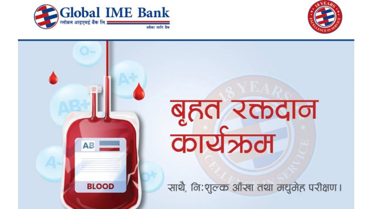 ग्लोबल आइएमई बैंक पौष १८ गते बिहीबारदेखि स्थापनाको १८ वर्ष पुरा गरी १९ औँ वर्षमा प्रवेश गरेको छ । यही अवसरमा बैंकले मुलुकका सात वटै प्रदेशमा एकैसाथ रक्तदान कार्यक्रमका साथ(साथै निःशुल्क आँखा जाँच, रक्तचाप तथा मधुमेह परीक्षण कार्यक्रम आयोजना गरेको हो ।