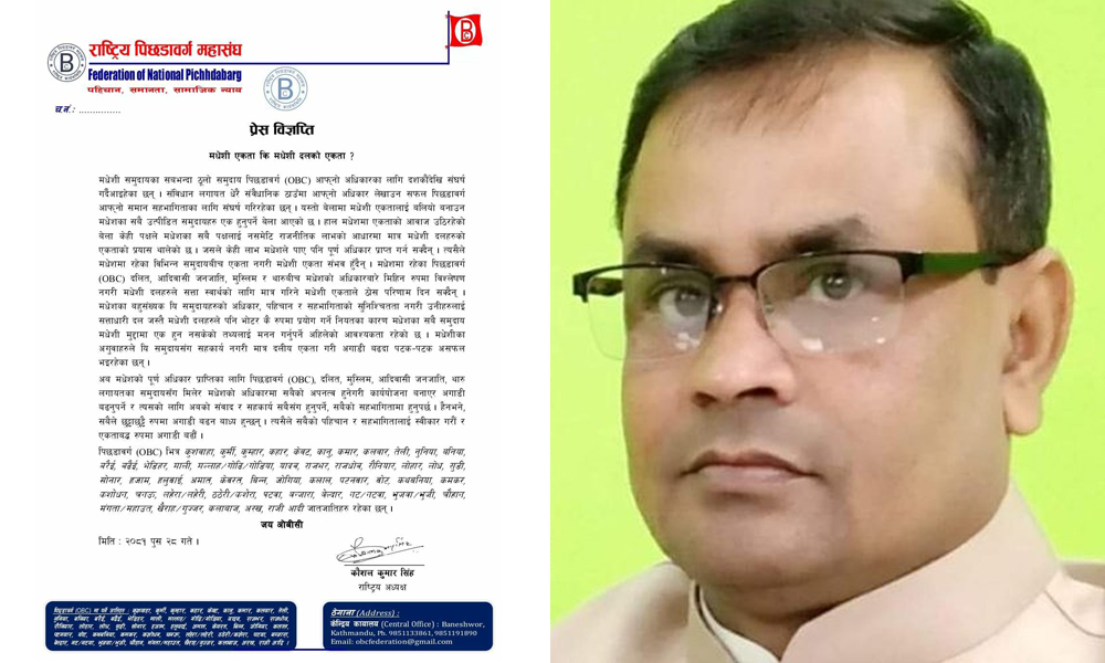 जनकपुरधाम । मधेशी दलहरुले एकता र सहकार्यको गृहकार्यमा जुटेको बेला राष्ट्रिय पिछडा वर्ग महासंघले सबै पक्षलाई समेट्न सम्बन्धित पक्षको ध्यानाकर्षण गराएको छ ।