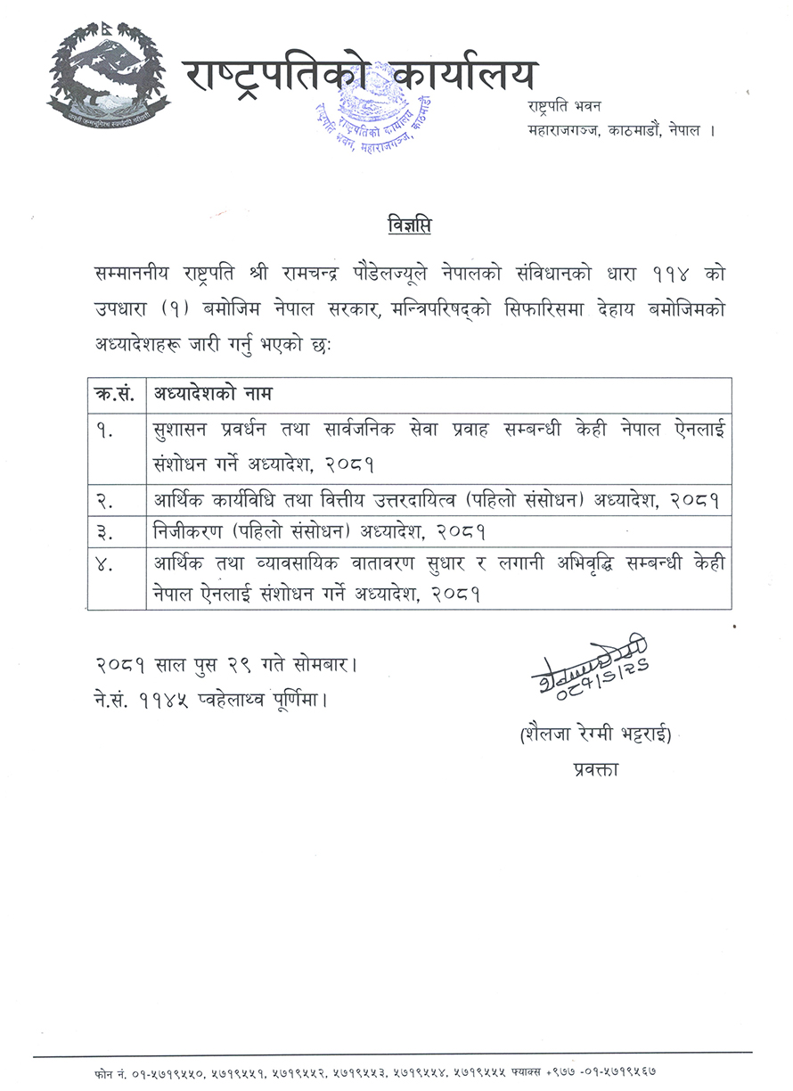 राष्ट्रपति कार्यालयकी प्रवक्ता शैलेजा रेग्मी भट्टराईका अनुसार सुशासन प्रवर्द्धन तथा सार्वजनिक सेवा प्रवाह सम्बन्धी केही नेपाल ऐनलाई संशोधन गर्ने अध्यादेश–२०८१, नेपाल कार्यविधि तथा वित्तिय उत्तरदायित्व पहिलो संशोधन अध्यादेश–२०८१, नीजिकरण पहिलो संशोधन अध्यादेश–२०८१ जारी भएकाे छ ।