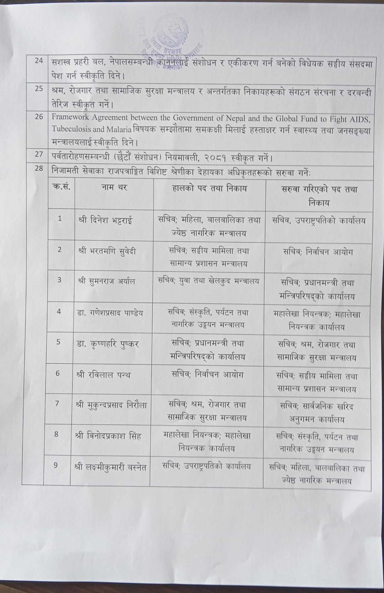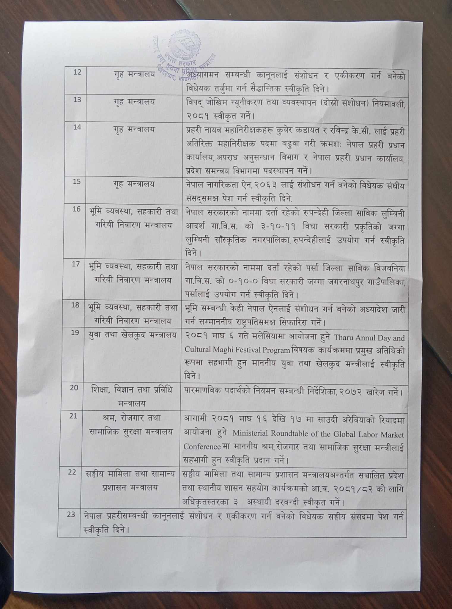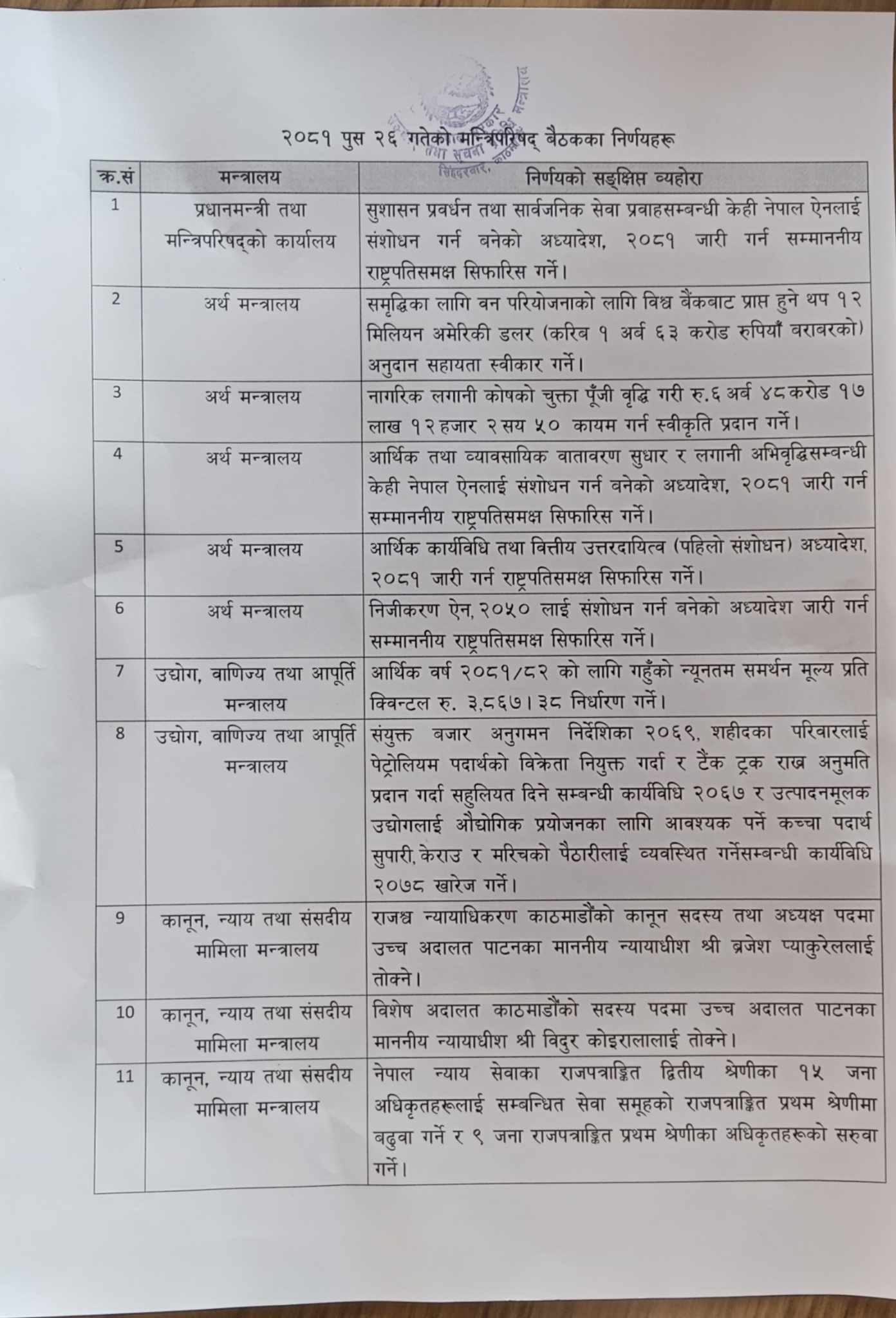 काठमाडौं । सरकारले मन्त्रिपरिषद् बैठकका निर्णय सार्वजनिक गरेको छ । सोमबार सरकारका प्रवक्ता एवम् सञ्चार तथा सूचना प्रविधिमन्त्री पृथ्वीसुब्बा गुरुङले पत्रकार सम्मेलन गर्दै पुस २६ गते बसेको मन्त्रिपरिषद् बैठकका निर्णय सार्वजनिक गरेका हुन् ।