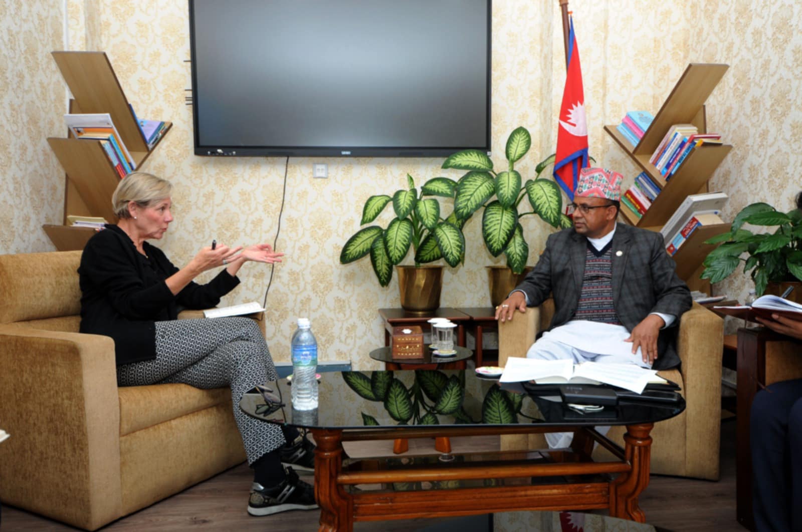 उनले भने, 'नेपाल र ईयूबीच सन् करीब पाँच दशक अघि कुटनीति सम्बन्ध स्थापना भएदेखि नै घनिष्ट कुटनैतिक सम्बन्ध रहेको छ । ईयू नेपालको प्रमुख विकास साझेदार हो । हामी हाम्रा सामाजिक, आर्थिक विकास प्रयासमा इयूको निरन्तर सहयोग प्रति कृतज्ञ छौं ।' उनले ईयूको आकाशमा नेपाली एयरलाएन्समाथि लगाइएको प्रतिवन्ध चाडैं फुकुवा गरेर सहयोग गरिदिन समेत अनुरोध गरे ।