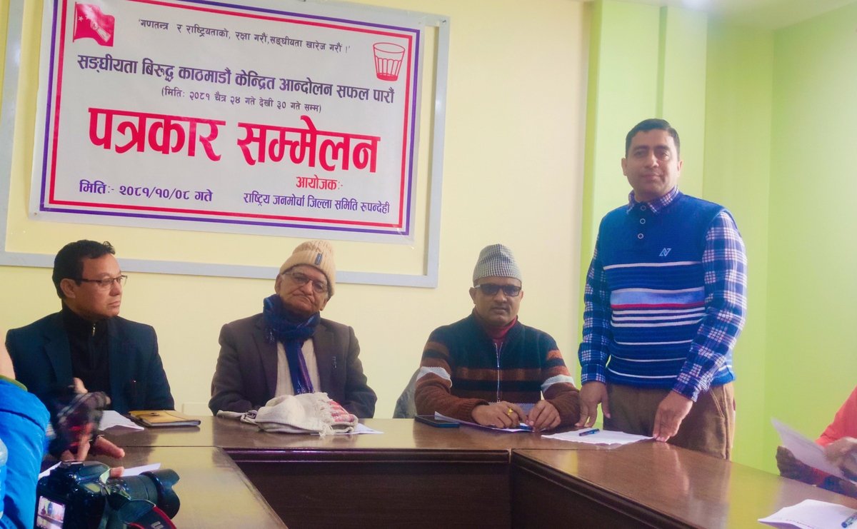 राष्ट्रिय जनमोर्चा रुपन्देहीले चैत्र २४ गतेदेखि ३० गतेसम्म गर्ने संघीयता विरुद्ध काठमाडौँ केन्द्रित आन्दोलनलाई सफल बनाउन विभिन्न कार्यक्रम सार्वजनिक गरेको छ । पत्रकार सम्मेलनमा बोल्दै जनमोर्चाका रुपन्देही अध्यक्ष टानबहादुर केसीले मंसिर महिना भरी जिल्लादेखि टोलसम्मका बैठक तथा भेलाहरू गर्ने कार्यक्रम तय भएको जानकारी दिए । यस्तै उक्त आन्दोलनलाई सफल बनाउनका लागि जिल्लाव्यापी पर्चा वितरण, भेटघाट, भित्ते लेखन गर्नुका साथै माघ १० गतेदेखि १२ गतेसम्म जिल्लाव्यापी घुम्ती कोणसभा गर्ने कार्यक्रम तय भएको बताए ।