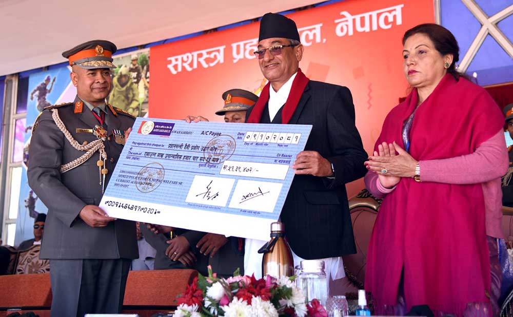 सशस्त्र प्रहरी बलको २४औँ वार्षिकोत्सवका अवसरमा सशस्त्र प्रहरी महानिरीक्षक राजु अर्यालले उक्त रकम बराबरको चेक गृहमन्त्री रमेश लेखकलाई हस्तान्तरण गरे ।