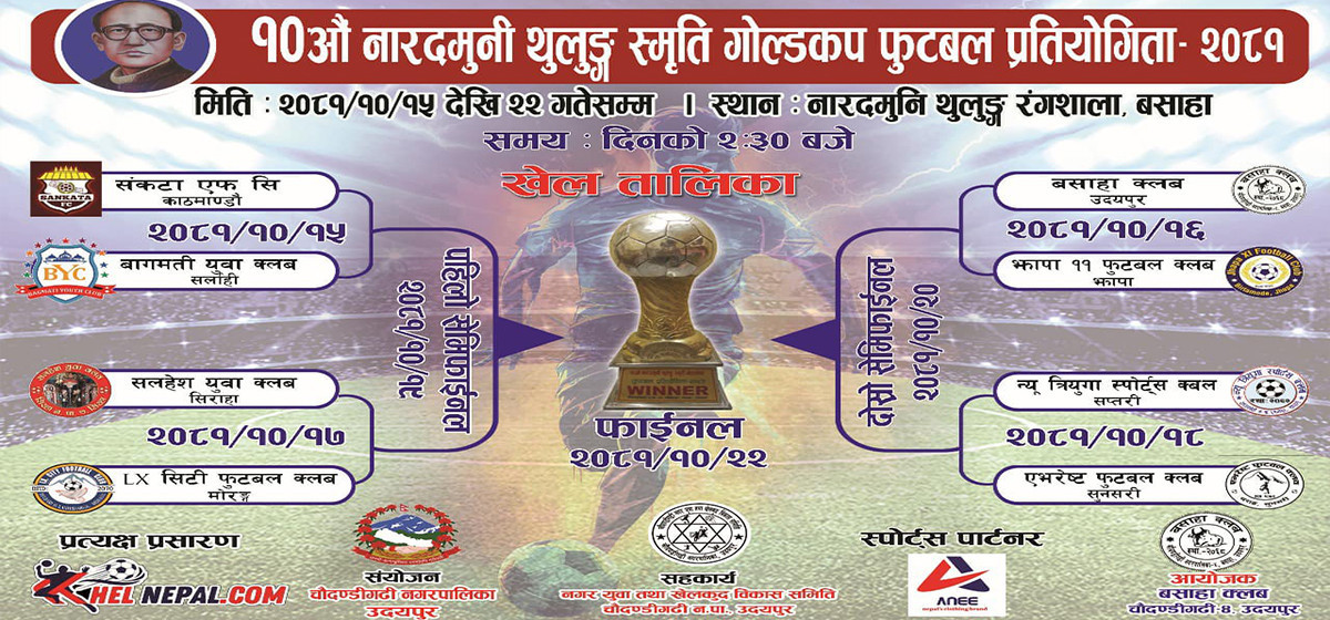उदयपुर । उदयपुरको चौदण्डीगढी नगरपालिका– ४ बसाहामा आयोजना हुँदै आएको नारदमुनि थुलुङ स्मृति गोल्डकप फुटबल प्रतियोगिताको दसाैँ संस्करण भोलि मंगलबारदेखि सुरु हुने भएको छ ।