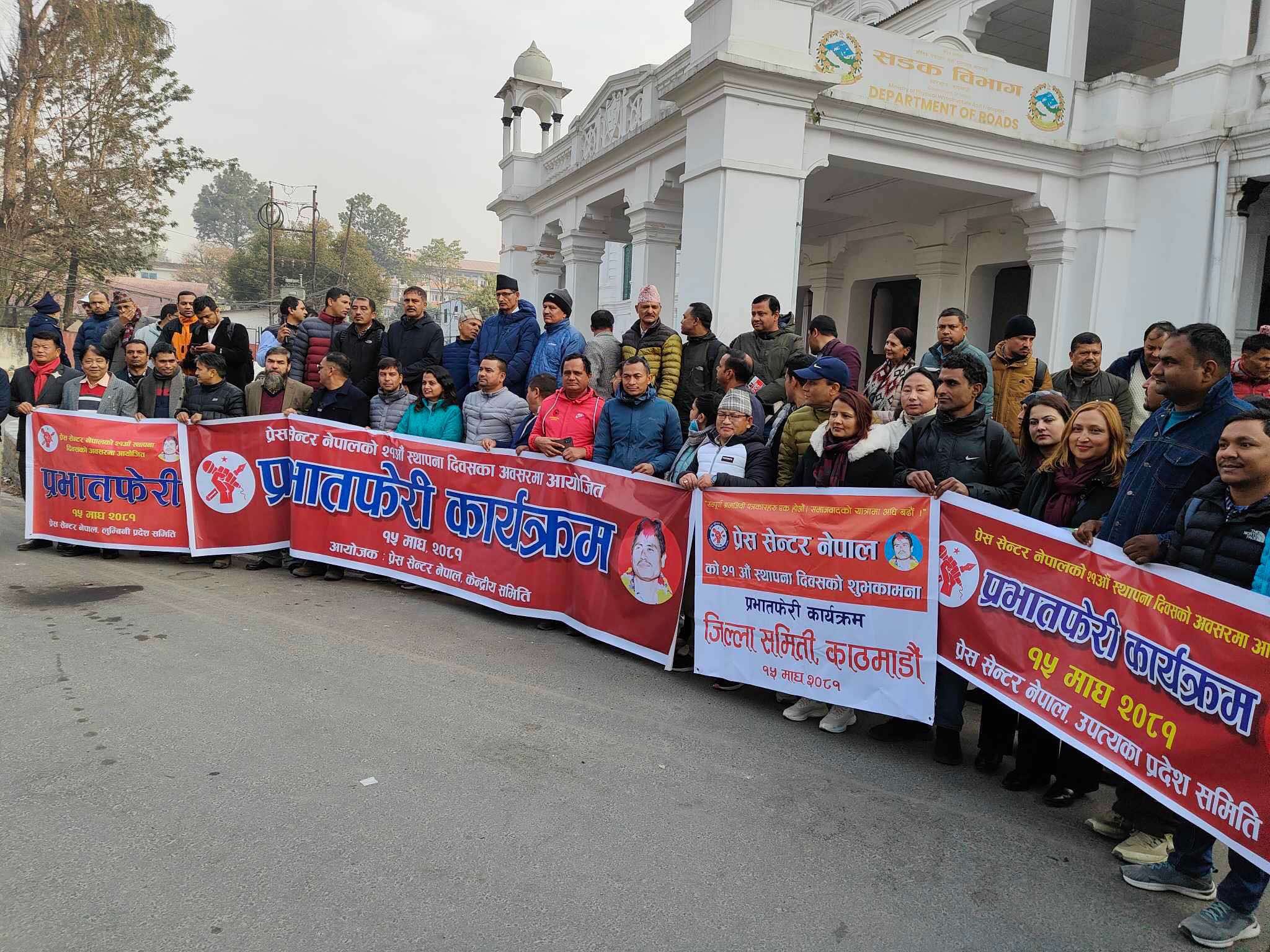 काठमाडौं । नेकपा (माओवादी केन्द्र) निकट प्रेस सेन्टर नेपालको २१ औँ स्थापना दिवसका अवसरमा प्रभातफेरि गरिएको छ । संगठन केन्द्रीय समितिको आयोजनामा मङ्गलवार बिहान सेन्टरको कार्यालय बबरमहलबाट प्रभातफेरि सुरु गरेर माइतीघर हुदै पुन संगठनको कार्यालयमा पुगेर कोणसभामा परिणत भएको थियो ।