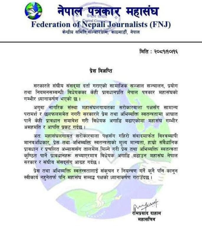 महासंघको विज्ञप्तिमा अगाडि भनिएको छ, ‘सरकारले संघीय संसदमा दर्ता गराएको सामाजिक सञ्जाल सञ्चालन, प्रयोग तथा नियमनसम्बन्धी विधेयकका केही प्रावधानप्रति नेपाल पत्रकार महासंघको गम्भीर ध्यानाकर्षण भएको छ ।’